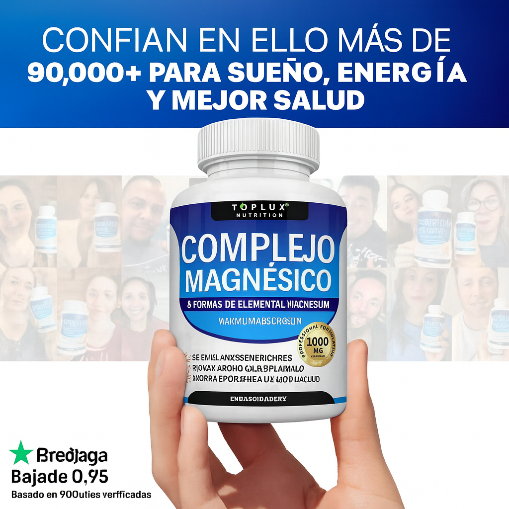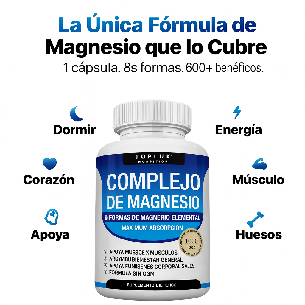 El Magnesium Complex de Tóplux combina 8 tipos de magnesio de alta absorción, diseñados para trabajar en conjunto y ofrecer un efecto completo: relajación, mejor descanso, energía estable y apoyo al sistema nervioso.