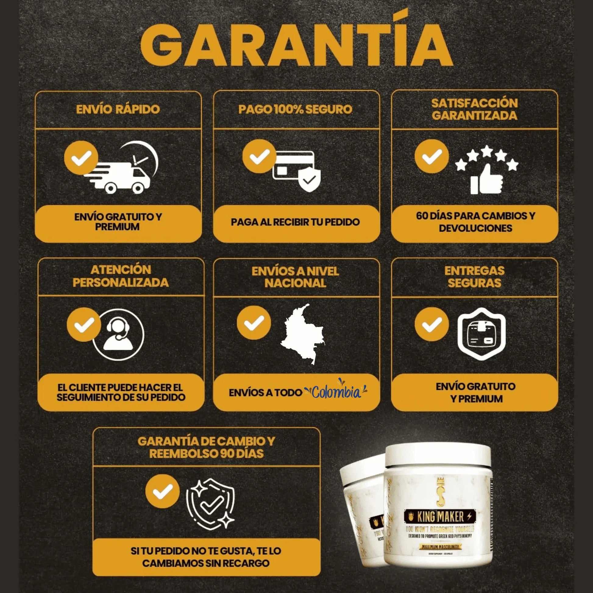 La rutina, el estrés y el paso del tiempo pueden disminuir tu energía, concentración y deseo. King Maker Plus es un suplemento natural premium diseñado para ayudarte arecuperar tu vitalidad, tanto física como emocional, de forma segura y sin efectos secundarios agresivos.